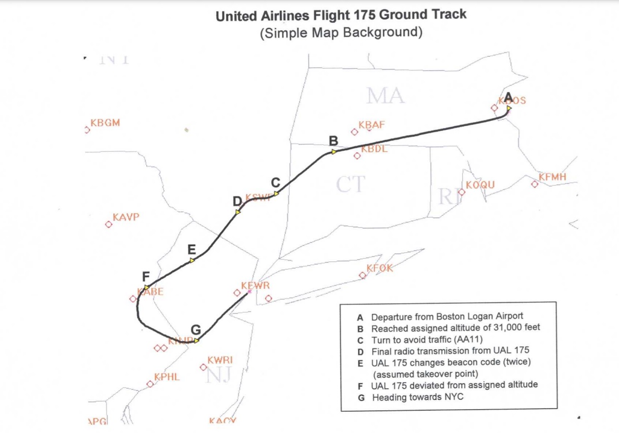 "United Airlines Flight 175 was a domestic passenger flight that was hijacked by five al-Qaeda terrorists on September 11, 2001, as part of the September 11 attacks. The flight's scheduled plan was from Logan International Airport, in Boston, Massachusetts, to Los Angeles International Airport, in Los Angeles, California. The Boeing 767-200 aircraft was deliberately crashed into the South Tower of the World Trade Center in New York City, killing all 65 people aboard and an unconfirmed number in the building's impact zone." Wikipedia - American_Airlines_Flight_175